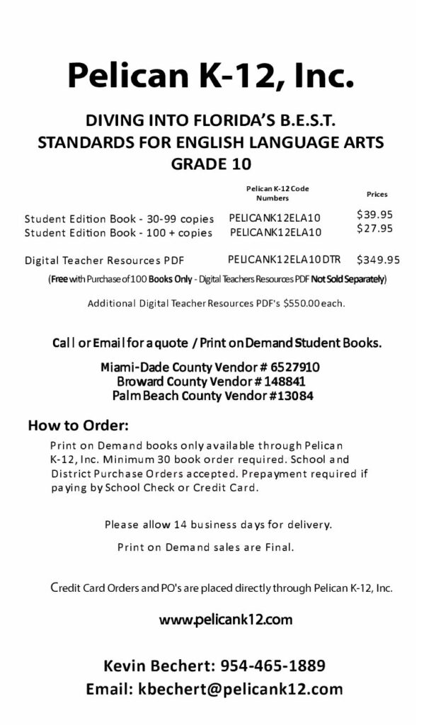 While writing Diving into Florida’s B.E.S.T. Standards for English Language Arts, Grade 10, the authors utilized the ELA Expectations and Benchmark Clarifications found in the state standards document. Texts chosen are based on the literary time periods as identified in the standards, and many appear on the tenth grade reading list found in the document. Additionally, the writers have strived to include diverse voices and perspectives in the texts.
